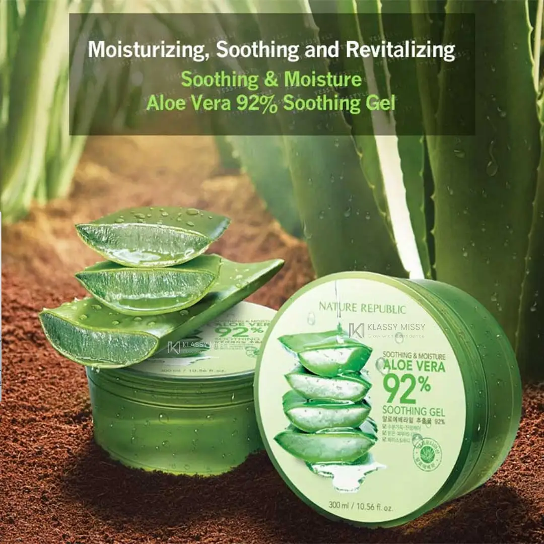 Nature Republic Soothing & Moisture Aloe Vera 92% Soothing Gel একটি হালকা ওজনের জেল যা ৯২% ক্যালিফোর্নিয়া সিসিওএফ-সার্টিফাইড অর্গানিক অ্যালোভেরা দিয়ে তৈরি। এটি ত্বককে তাৎক্ষণিকভাবে হাইড্রেট করে এবং শুষ্ক, সংবেদনশীল বা জ্বালাপোড়া ত্বকে প্রশান্তি দেয়। এর দ্রুত শোষণযোগ্য, অ-আঠালো ফর্মুলা মুখ, শরীর এবং চুলে ব্যবহারের জন্য উপযুক্ত, যা ত্বকে সতেজতা এবং প্রশান্তি প্রদান করে।
